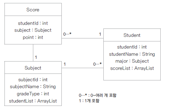 - 학생이 수강한 과목들에 대한 성적을 산출하기 위한 경우 학생 클래스 속성에 과목이 모두 있으면 불합리