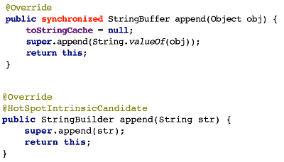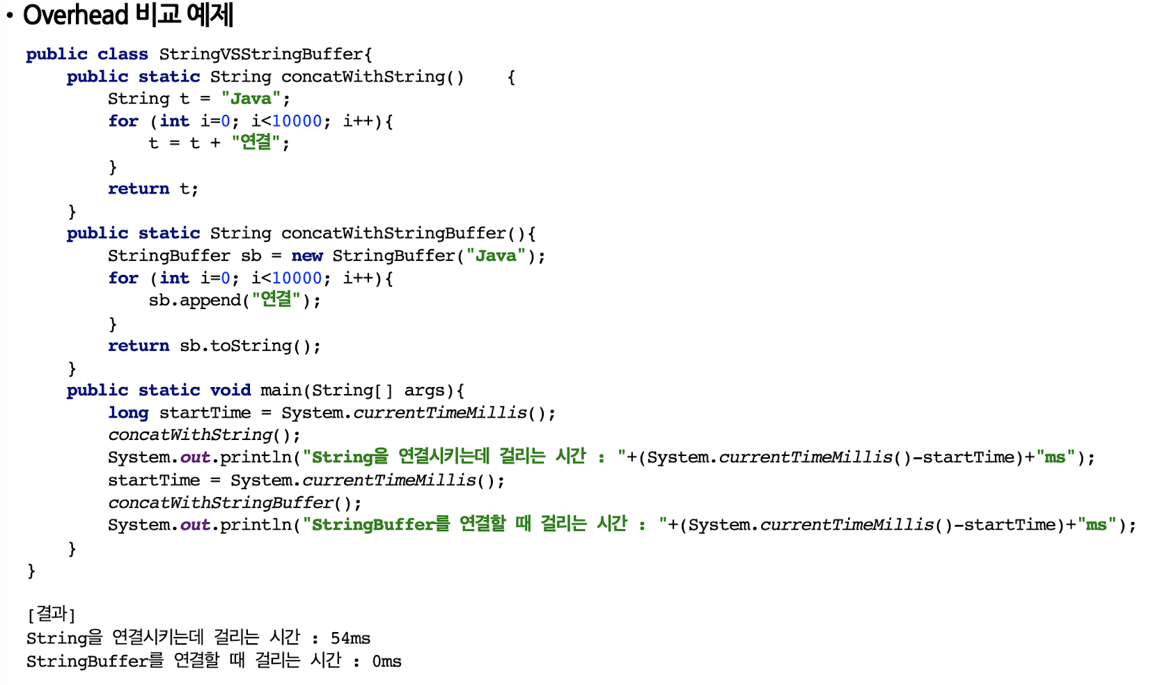 - 멀티스레드 환경에서 불변 객체인 String의 경우에는 값이 변하지 않는다는 점이 보장되므로 스레드 세이프 처리를 하지 않아도 된다.변경가능한 객체인 StringBuffer의 경우에 스레드 세이프한 처리한 코드를 가지고 있다. (즉, syncronized- 동기화 처리 수행)