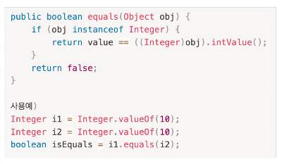 - 객체 자신과 파라미터로 전달된 객체를 비교 참조 값을 비교