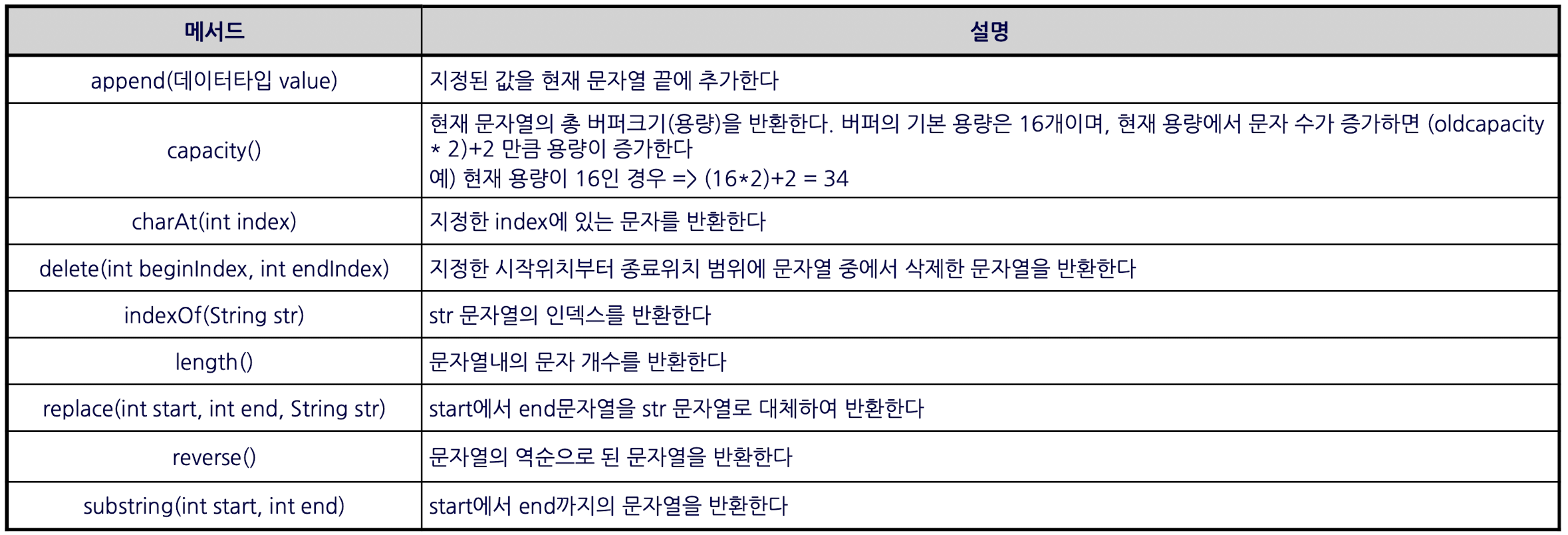 - 변경 가능한 문자열은 StringBuffer, StringBuilder 클래스를 사용할 수 있다.