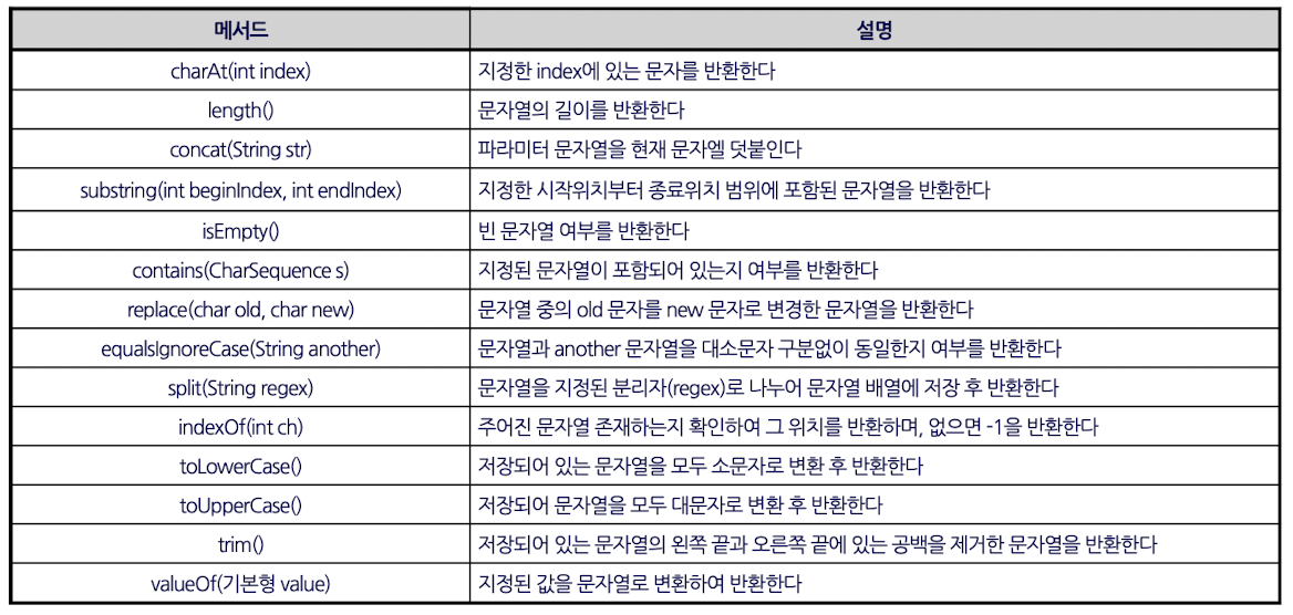 - compare(), concat(), equals(), split(), length(), replace(), compareTo(), intern(), substring() 문자열 작업 수행하는 메서드가 존재한다.