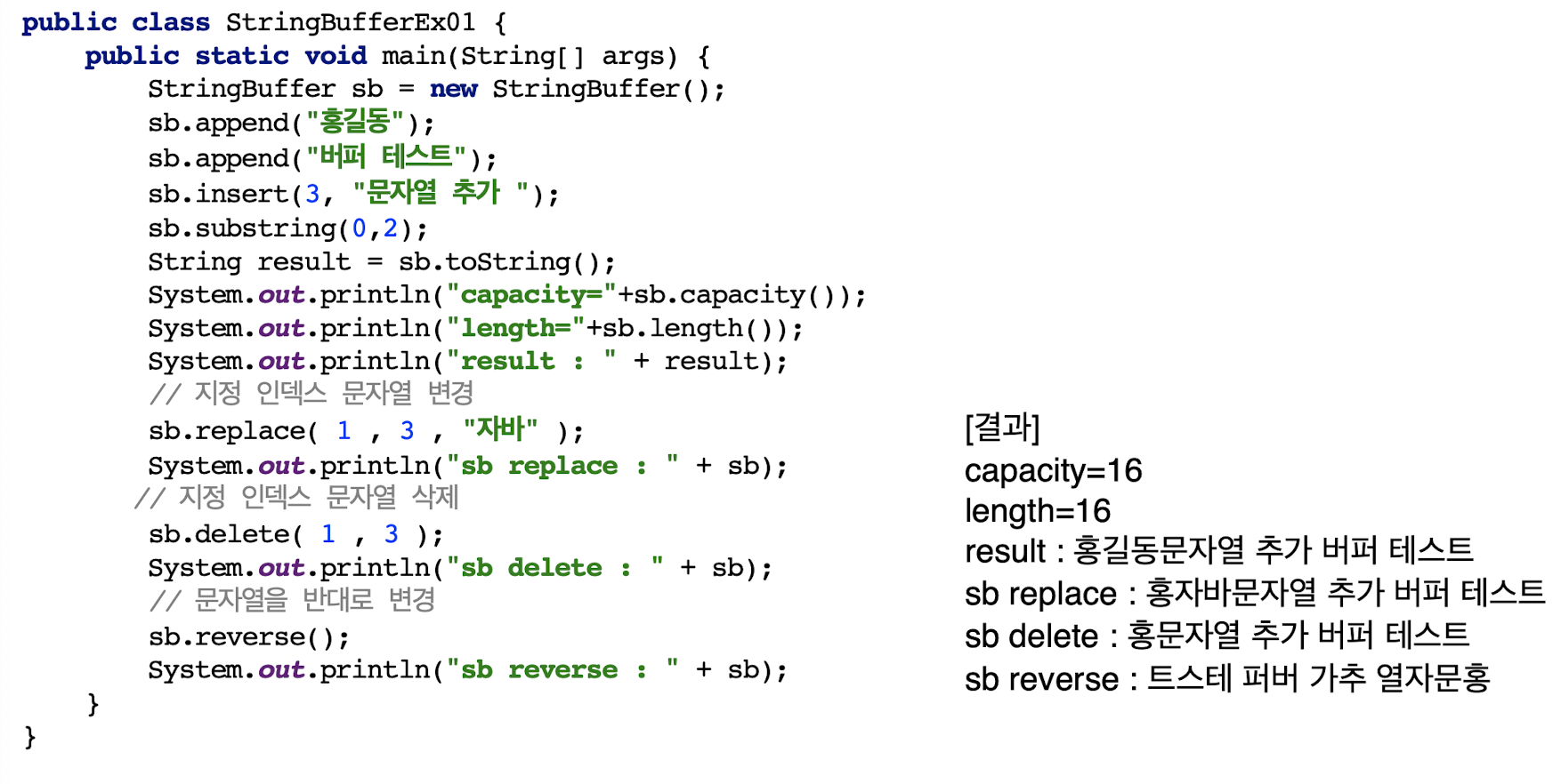 - StringBuffer(int capacity) : 매개변수만큼 버퍼를 초기화해 생성