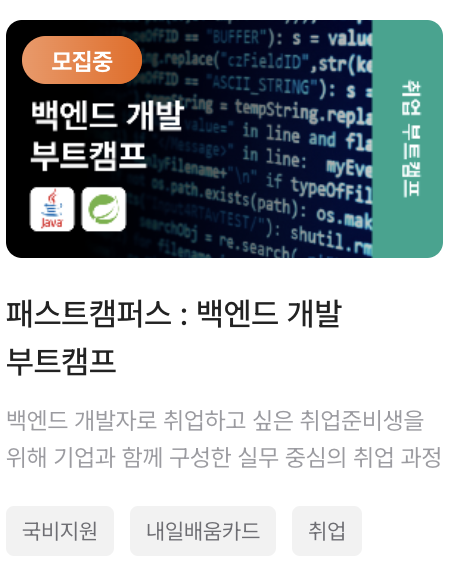 하지만 실무를 접하면서 코딩을 하지 않고서, 역량을 키우거나 비전을 높이기에는 어려움이 따른다는 것을 느끼게 되었고, 백엔드 개발자로의 커리어 전환을 위해 패스트캠퍼스 백엔드 개발 부트캠프에 참여하게 되었습니다.