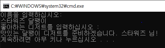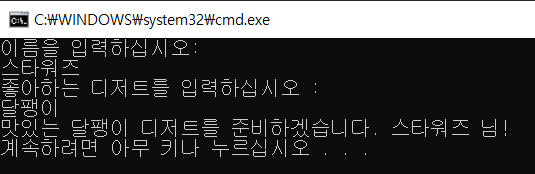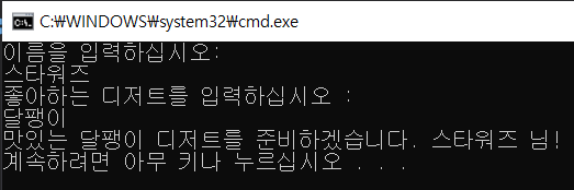 cout << "좋아하는 디저트를 입력하십시오 : \n";