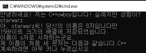 cout << strlen(name1) << "자입니다만 \n"; //배열에 저장된 문자열의 크기 [눈에 보이는 문자만]