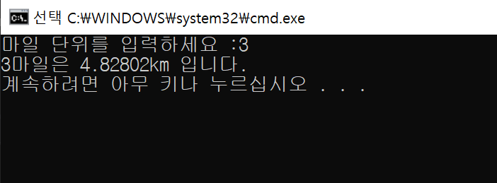 cout << insert << "마일은 " << mileTokm(insert) << "km 입니다." << endl;;