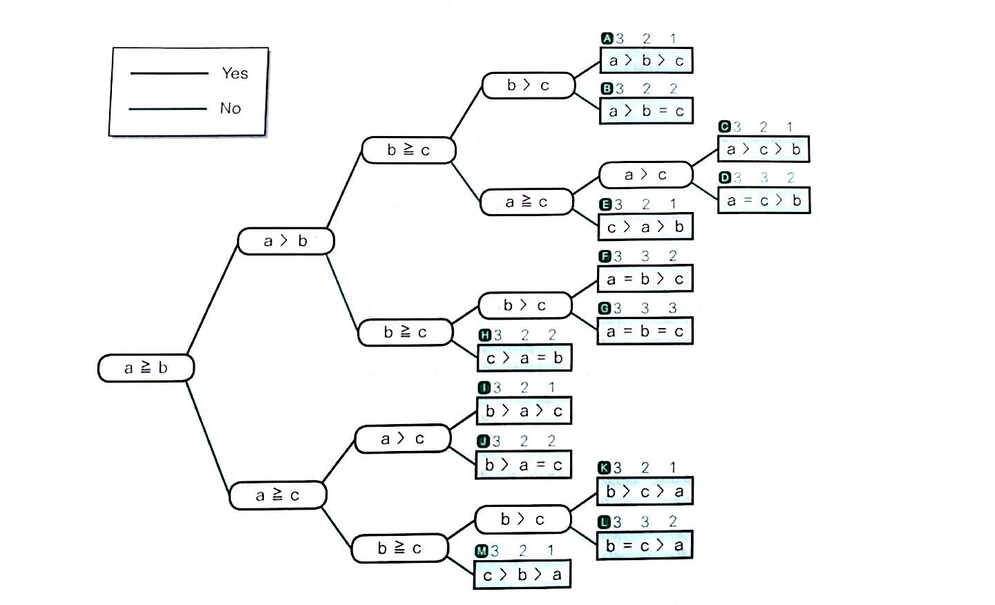 //a>b>c, a>b=c, a=b>c, a=b=c