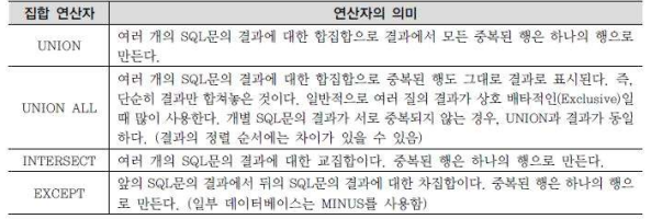 | 집합 연산자 | 여러 개의 질의의 결과를 연결하여 하나로 결합하는 방식을 사용한다. 즉, 집합 연산자는 2개 이상의 질의 결과를 하나의 결과 |