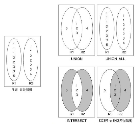결과 집합에 대해 합집합(UNION / UNION ALL), 교집합 (INTERSECT), 차집합(EXCEPT)으로 집합간의 관계를 이용