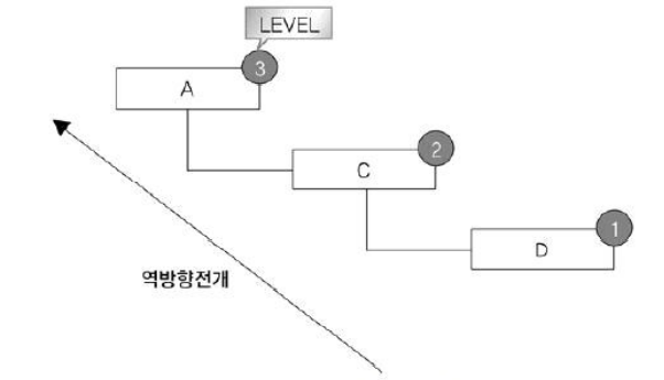 | PRIOR | CONNECT BY절에 사용되며, 현재 읽은 칼럼을 지정. PRIOR 자식 = 부모 : 자식 데이터에서 부모 데이터(자식 → 부모) 방향으로 전개하는 순방향 전개 PRIOR 부모 = 자식 : 부모 데이터에서 자식 데이터(부모 → 자식) 방향으로 전개하는 역방향 전개 |