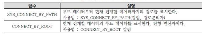 | CONNECT BY | CONNECT BY에 주어진 조건을 만족하는 자식 데이터를 지정. (조인) |