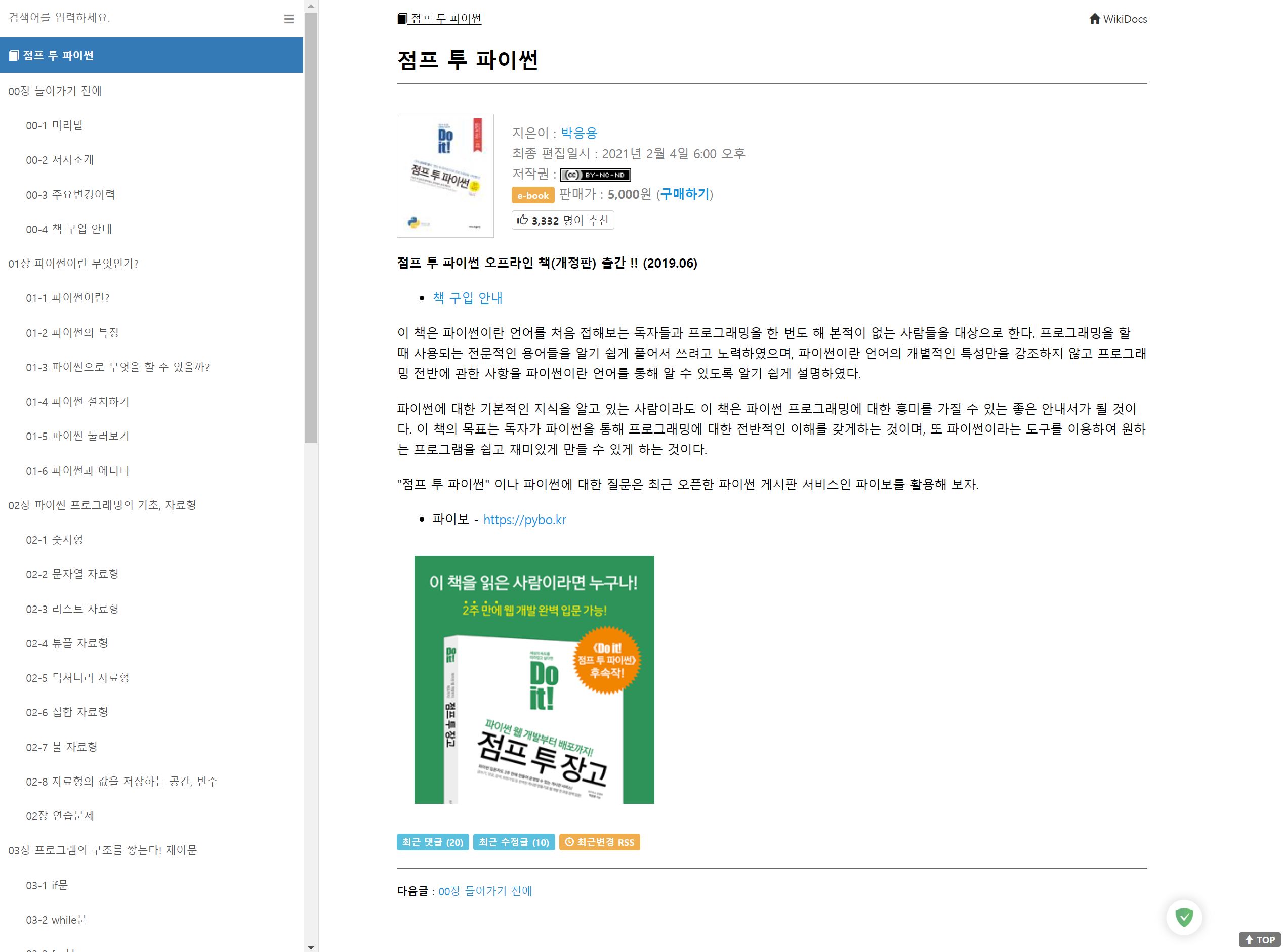 위키독스는 온라인 책을 제작 공유하는 플랫폼 서비스이며, 점프 투 파이썬이라는 책은 실제로 오프라인에 판매하는 책이다.