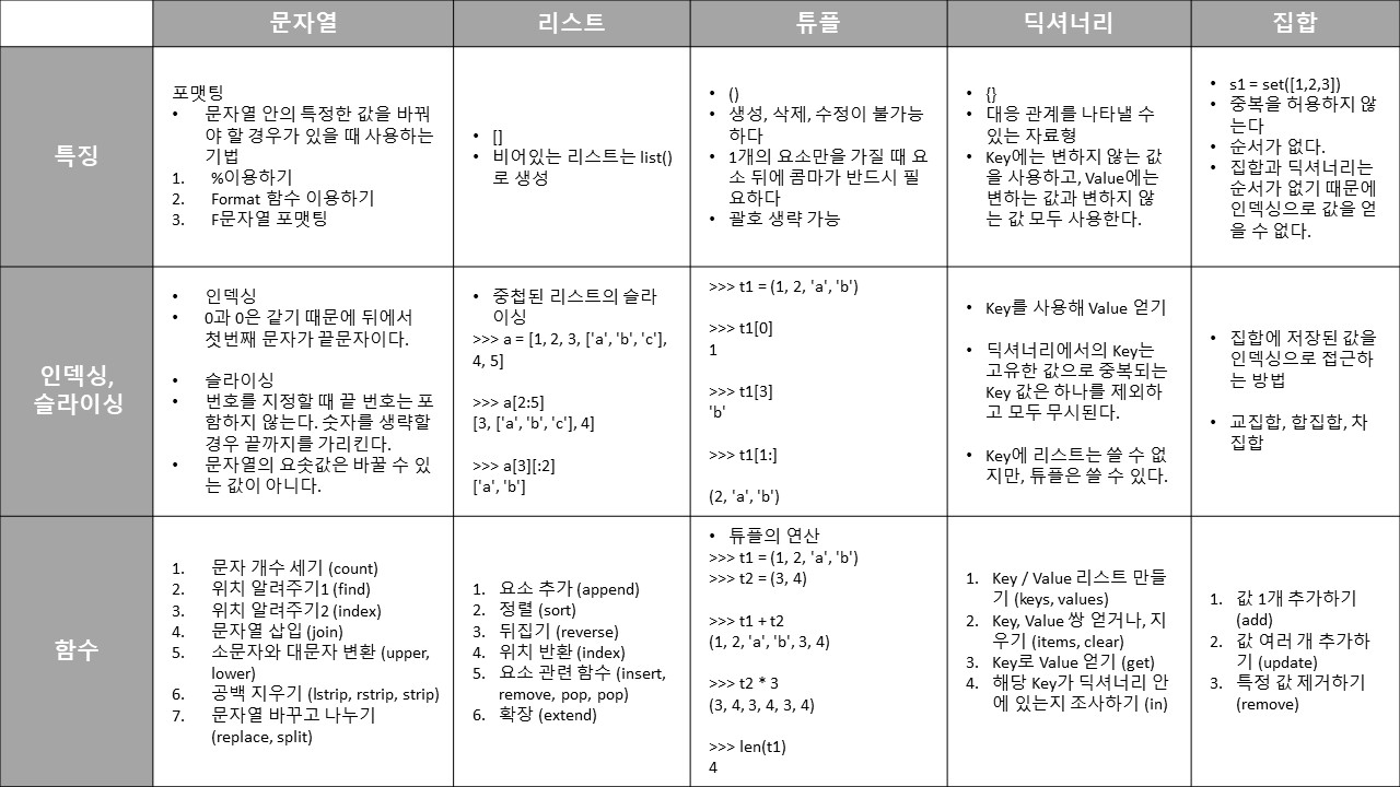 >>> s1 = set([1,2,3]) >>> s1 {1, 2, 3} >>> s2 = set("Hello") >>> s2 {'e', 'H', 'l', 'o'} 집합 자료형의 생성 s = set() 비어 있는 집합 자료형 집합 자료형의 특징 중복을 허용하지 않는다 순서가 없다. 리..