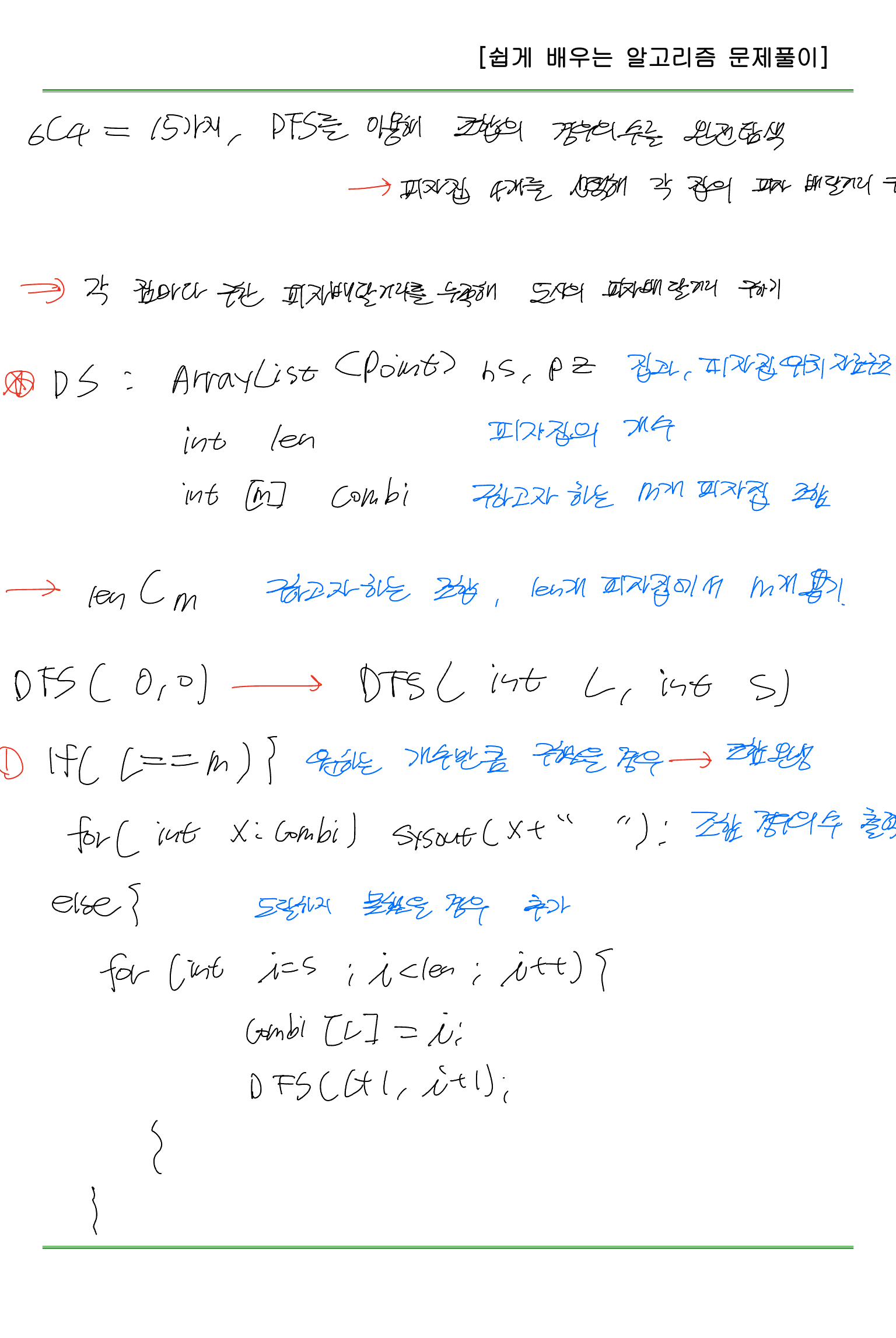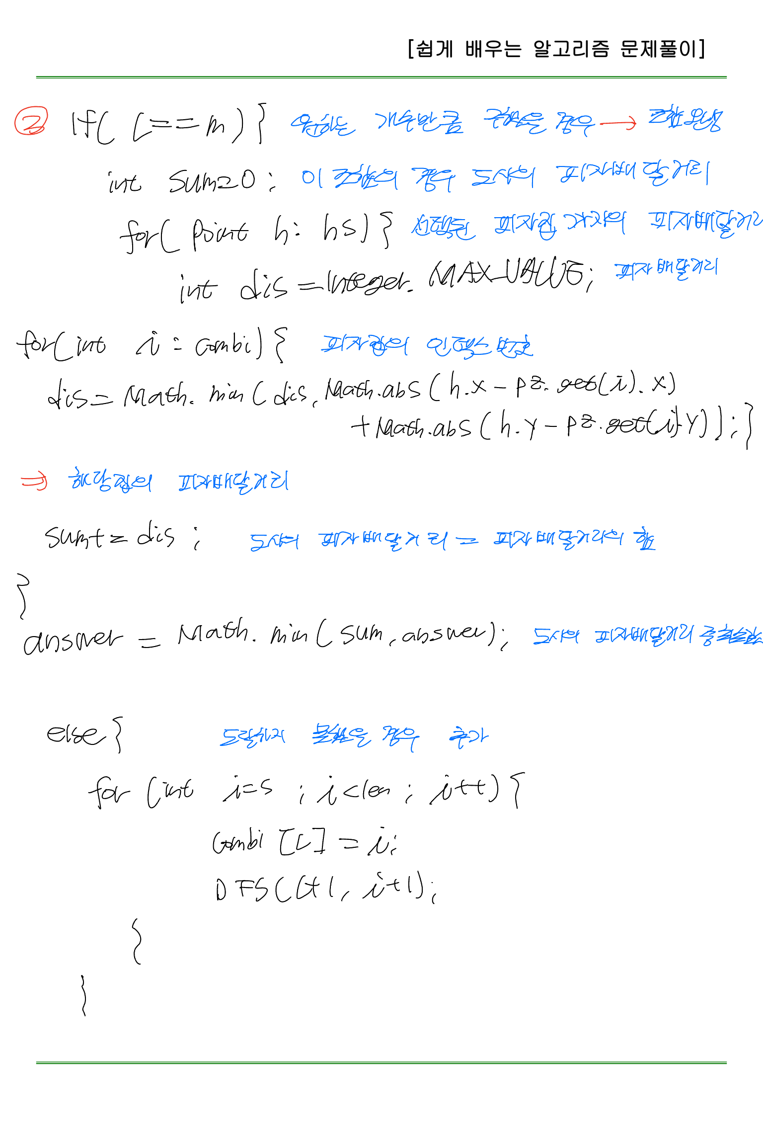 시장은 살리고자 하는 피자집 M개를 선택하는 기준으로 도시의 피자배달거리가 최소가 되는 M개의 피자집을 선택하려고 합니다.