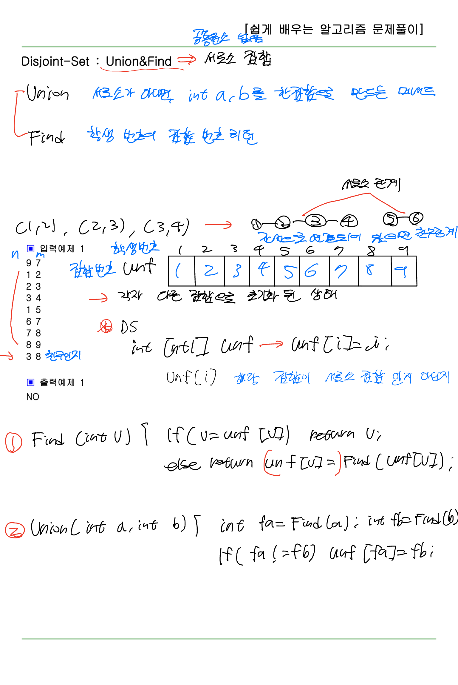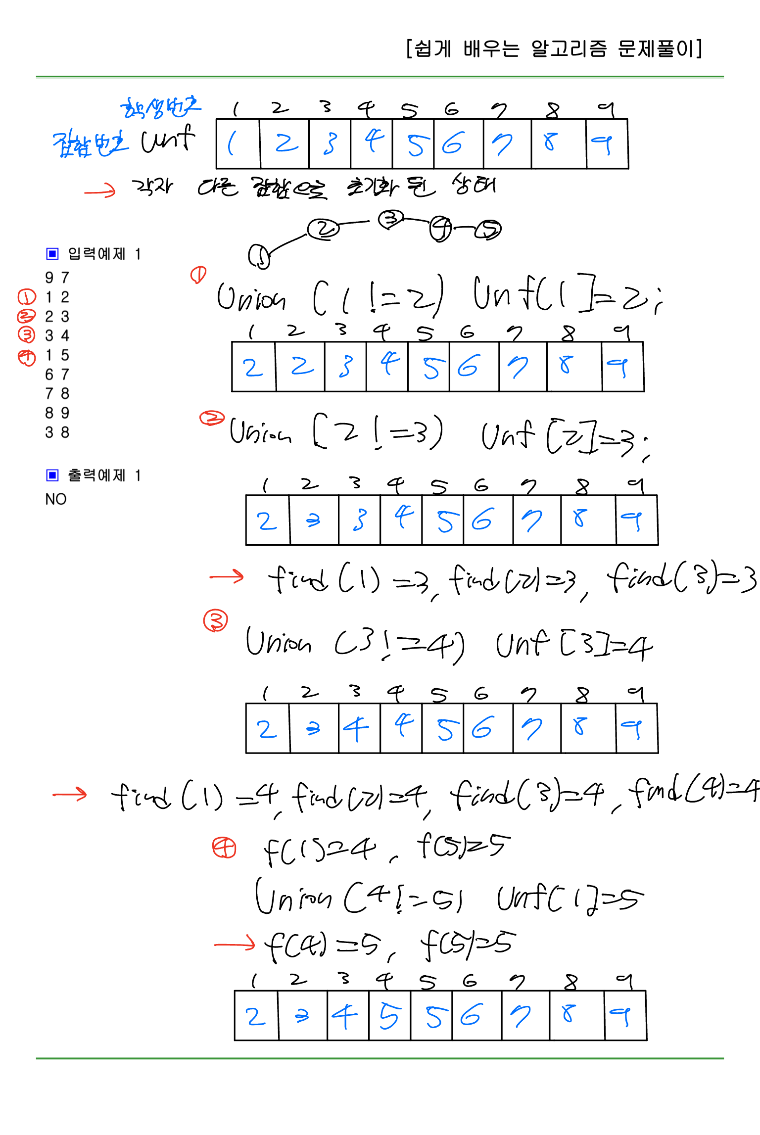 만약 (1, 2), (2, 3), (3, 4)의 숫자쌍이 주어지면 1번 학생과 2번 학생이 친구이고, 2번 학생과 3번 학생이 친구, 3번 학생과 4번 학생이 친구이다.