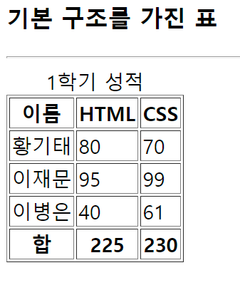 <tr><th>이름</th><th>HTML</th><th>CSS</th></tr>