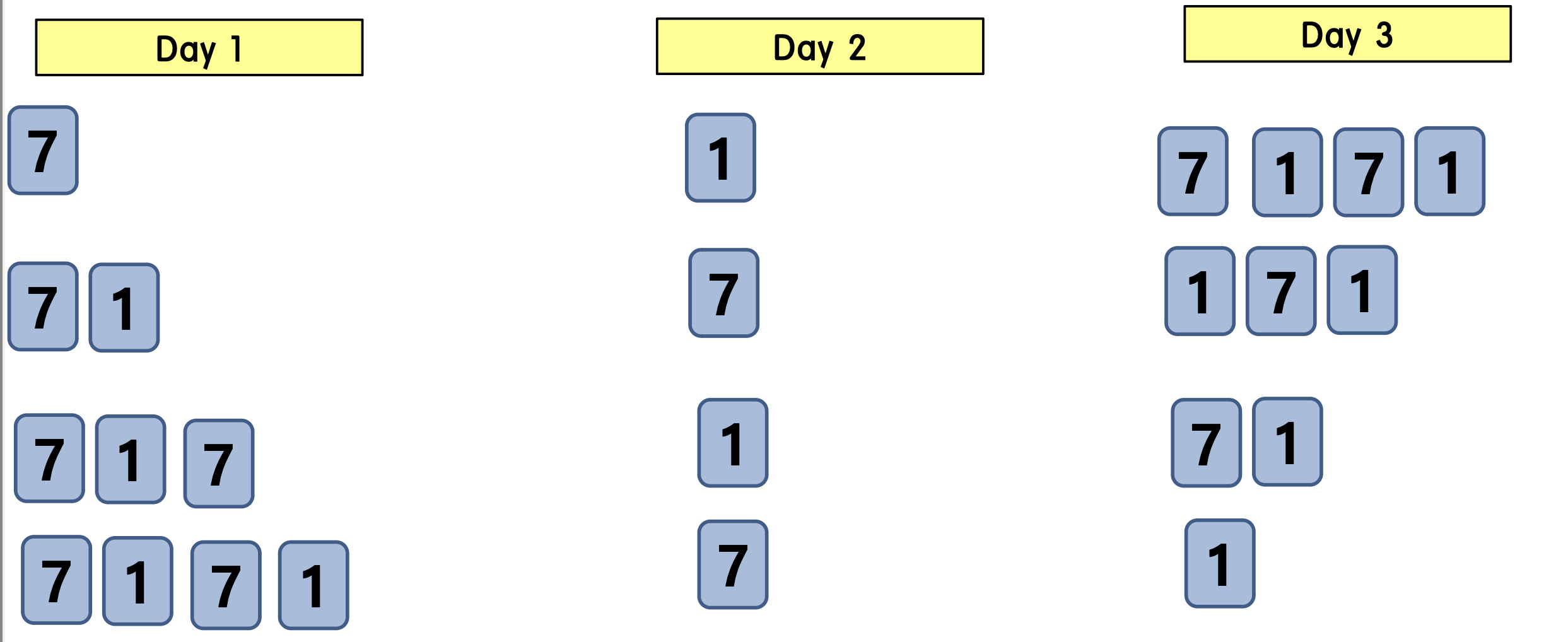 - 7+1+7= 첫째 날의 최댓값 7, 두번째날의 최댓값 1, 세번째날의 최댓값 7