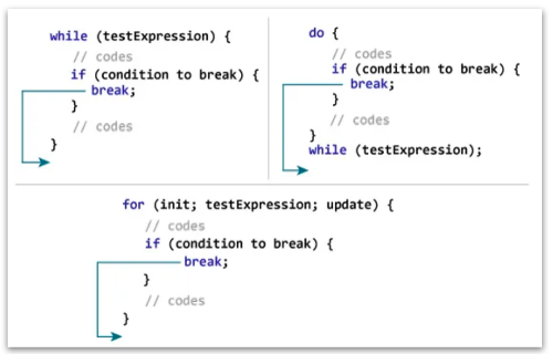 - 'break' : switch문 뿐만 아니라 반복문을 강제로 빠져나오게 한다.